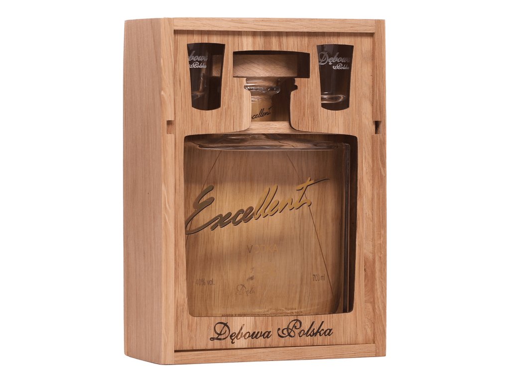 Výborná vysokokvalitná poľská Wódka Excellent od značky Dębowa, ktorá sa nachádza vo veľmi netradičnej drevenej darčekovej krabičke s dvomi pohárikmi.