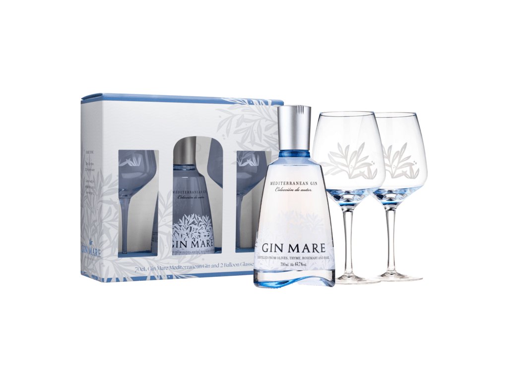 Darčekový set obsahujúci španielsky gin Gin Mare + dva poháre pre jeho štýlové vychutnávanie.