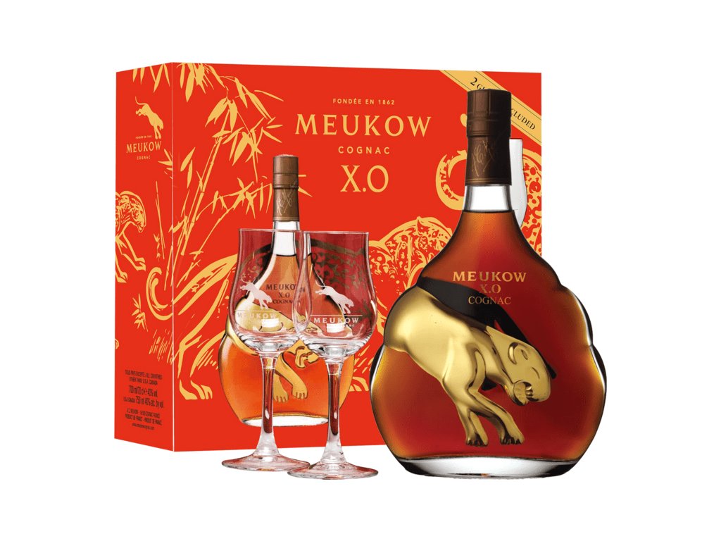 Luxusný starý francúzsky cognac Meukow XO, ktorý sa nachádza v darčekovom balení spolu s dvoma pohármi.