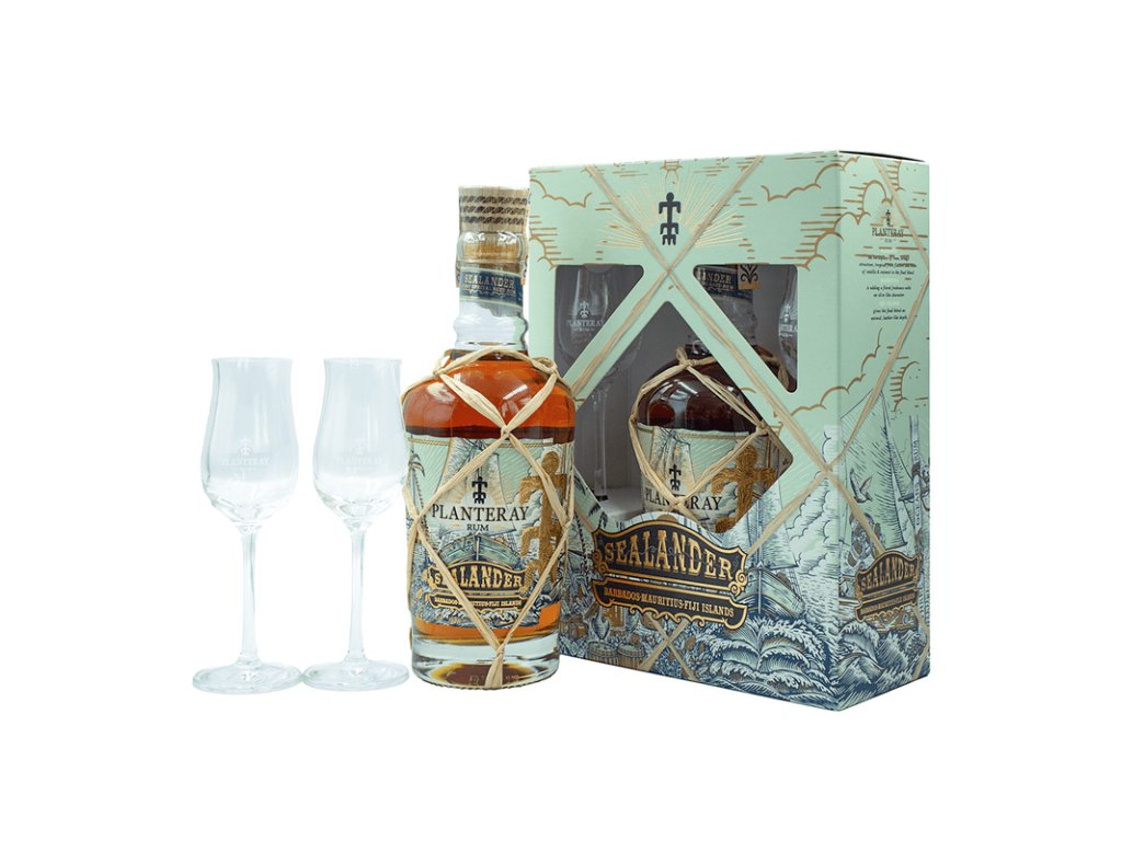 Ikonický rum Sealader, v pôsobivom a bohato zdobenom darčekovom balení s dvomi pohármi na stopke.