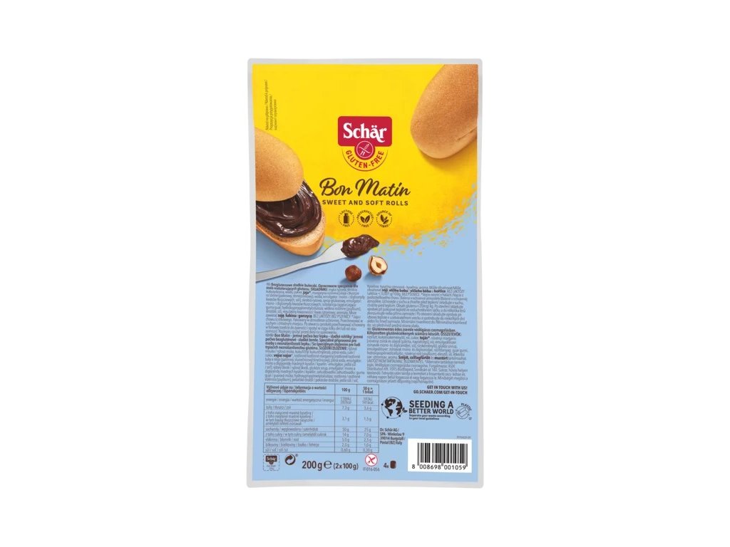 Jemné bezlepkové sladké žemle určené pre osoby s intoleranciou na lepok. Mäkká textúra a jemná chuť robia z Bon Matin ideálne raňajkové pečivo alebo desiatu. Balené v ochrannej atmosfére.