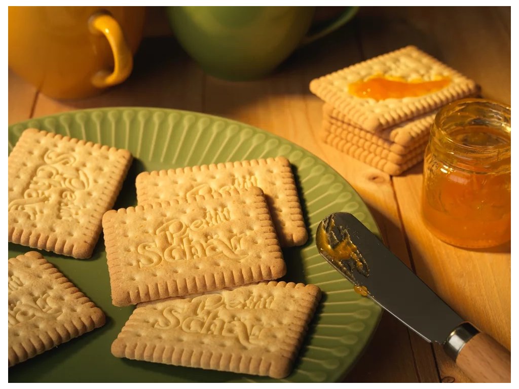 Zloženie: kukuričný škrob , kukuřičná múka , máslo (mlieko) , cukor , modifikovaný tapiokový škrob , vajce , sušené plnotučné mlieko , sirup z cukrovej repy , emulgátor: estery mono- a diacetylvínnych kyselín s mono- a diglyceridmi mastných kyselín (repkový) ; kypriaci látka: hydrogénuhličitan amónny , sóda bikarbóna ; jedlá soľ , prírodné aróma , regulátor kyslosti: kyselina citrónová . Môže obsahovať stopy sóji a vlčieho bôbu .
