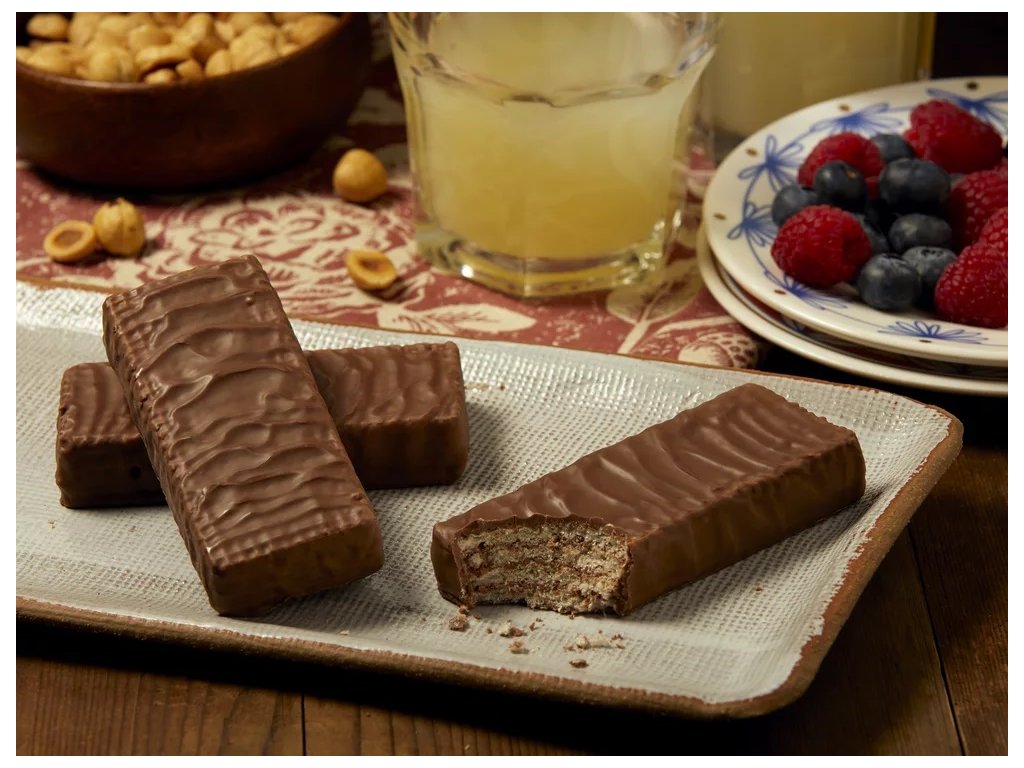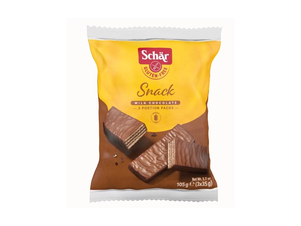 Lahodné bezlepkové oplátky Snack sú máčané v čokoláde a plnené lieskovorieškovým krémom. Neobsahujú lepok, pšenicu, vajcia a konzervačné látky.