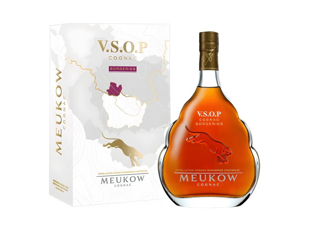 Značka Meukow založená v roku 1862 bratmi Meukowovcami v Cognacu, sa rýchlo presadila ako dodávateľ koňakov cárskemu dvoru. Do sveta ich preslávila ikonická fľaša lemovaná čiernym panterom – symbolom odvahy a elegancie. Dnešný VSOP Borderies reprezentuje špecializovaný remeselnícky prístup v rámci širšieho portfólia VSOP edícií.