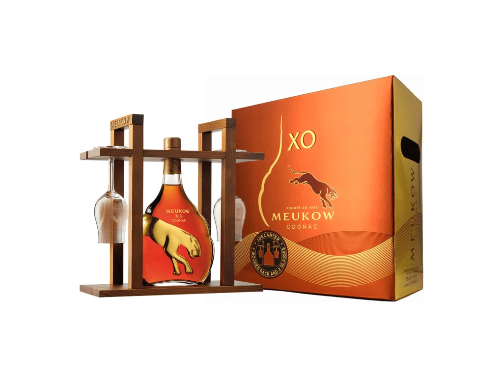 Vychutnajte si luxusný cognac Meukow XO Rack v darčekovom balení s 2 pohármi a atraktívnym dreveným stojanom!