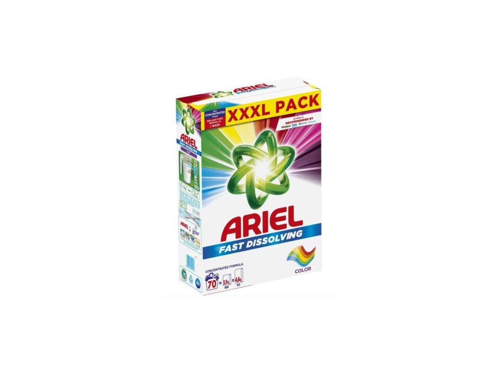 Prací prášok Ariel s koncentrovaným zložením poskytuje koncentrovanejšiu silu a operie viac bielizne na jeden gram prostriedku. Zaisťuje vynikajúce odstraňovanie škvŕn už pri 1. praní. Vďaka jedinečnej technológii rýchlorozpúšťania sa pri kontakte s vodou rýchlo rozpustí, ihneď aktivuje a preniká hlboko do vlákien aj pri praní na nižších teplotách. Znížte teplotu prania na 30 °C a ušetrite až 60 % energie. (Spotreba energie práčkou pri prechode zo 60 °C na 30 °C, bežný cyklus). Programy na pranie pri nižších teplotách pomáhajú chrániť vašu bielizeň dlhšie ako programy na pranie pri vyšších teplotách. Zloženie s obsahom biologicky odbúrateľných zložiek (80 % všetkých organických zložiek je biologicky odbúrateľných). Navyše má prací prášok Ariel Na farebnú bielizeň úplne recyklovateľný kartónový obal vyrobený z papiera s 80 % podielom recyklovaného materiálu.
