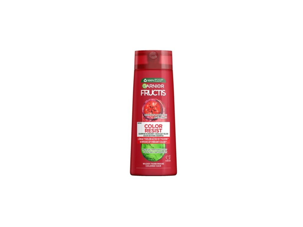 Šampón na vlasy Fructis Color Resist je určený pre farebné a melírované vlasy. Je obohatený o olej z ľanových semienok, ktorý farbu chráni a extrakt z bobúľ Acai, ktoré vlasy vyživujú. Chráni vlasy pred opätovným poškodením. Najlepšie výsledky dosiahnete pri pravidelnom používaní.
