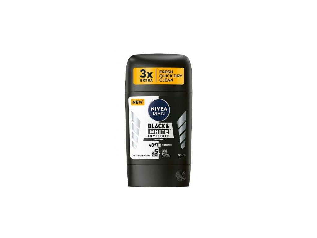 Pánsky tuhý deodorant Nivea Invisible black&white s ľahkou vôňou poskytuje svieži pocit a ochranu pred potom po celý deň. Predchádza vzniku bielych stôp na tmavom oblečení a žltých škvŕn na bielom oblečení. Bez farbív a alkoholu. Deodorant aplikujte priamo na pokožku.