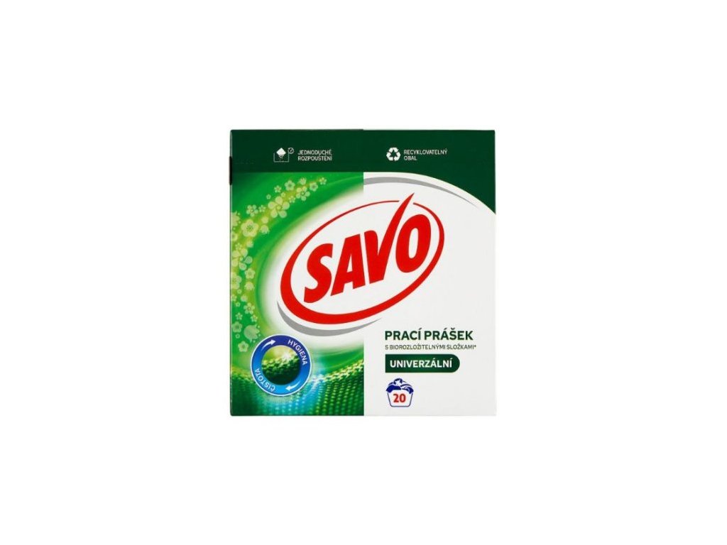 Savo Univerzálny prášok na pranie si poradí aj s odolnými škvrnami. Stará sa o farebné aj biele oblečenie a zanechá ho hygienicky čisté.