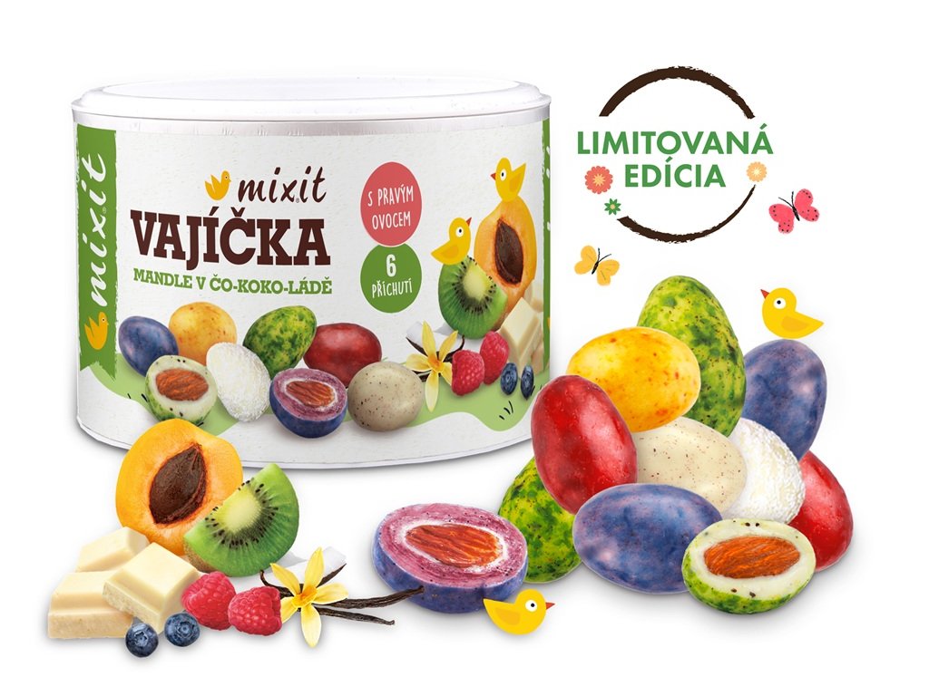 Veselá Veli-koko-nočná limitovaná edícia Mixit vajíčok je späť! Mixit sliepky opäť zniesli tie najsladšie čokoládové vajíčka. Vo vnútri každého vajíčka nájdete chrumkavú mandle obalenú v bielej čokoláde, ochutenú lyofilizovaným ovocím a ďalšími prírodnými ingredienciami. A ako je u nás zvykom, sú bez umelých farbív a palmového oleja. Veli-koko-noce sú pripravené na koko-šibačov!