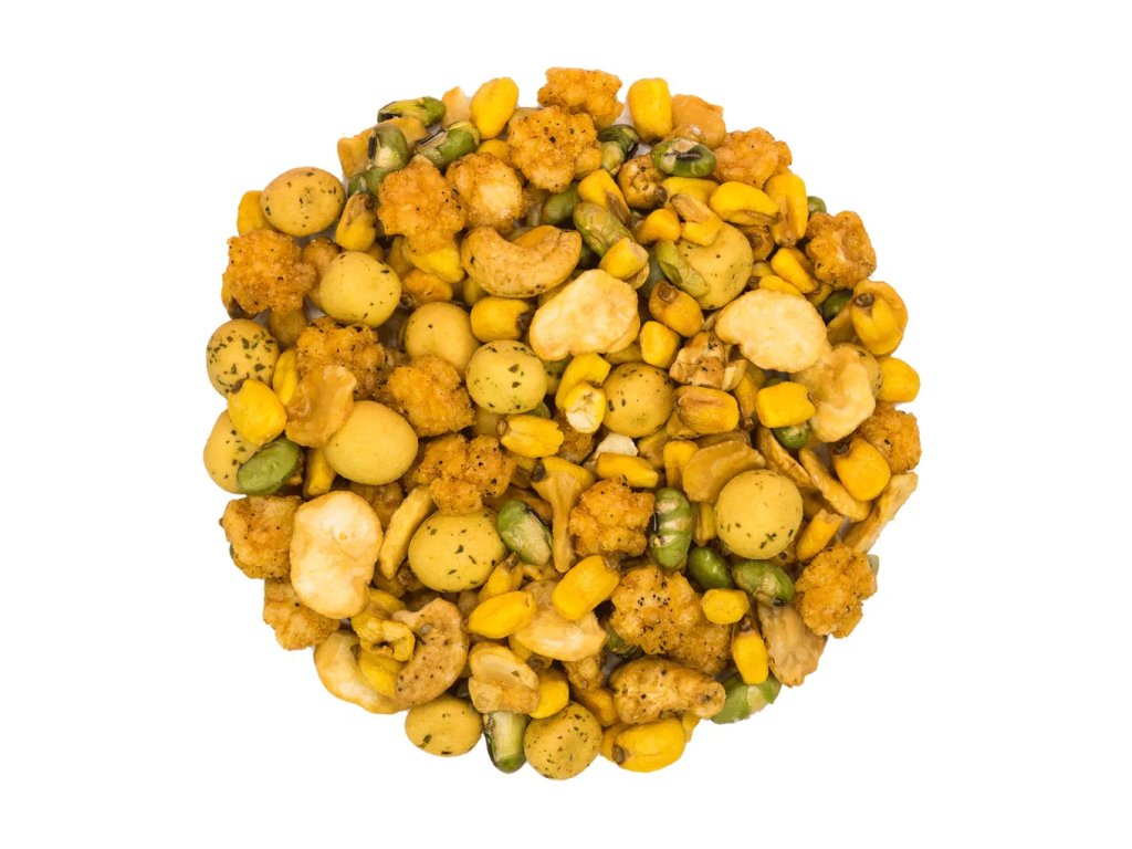 - Zloženie: EDAMAME PRAŽENÉ SOLENÉ (edamame fazole 97,7 %, sůl 1,3 %, uhličitan sodný 1 %); KUKUŘICE PRAŽENÁ SOLENÁ (kukuřice 86 %, slunečnicový olej 13 %, sůl 1 %); ARAŠÍDY V BYLINKOVÉM TĚSTÍČKU (arašídy 32 %, pšeničná mouka 28 %, cukr 19 %, modifikovaný kukuřičný škrob 13 %, slunečnicový olej 3 %, koření bylinky & cibule 2,6 % – maltodextrin, sůl, cukr, česnek prášek, cibule prášek, kvasnicový extrakt, zvýrazňovač chuti: guanylan sodný E627 a inosinan sodný E631; šalotkový olej, slunečnicový olej, sezamový olej, příchuť); RÝŽOVÉ KREKRY S PEPŘEM (rýže 38,95 %, slunečnicový olej 37,98 %, cukr 10,47 %, tapiokový škrob 4,57 %, maltodextrin 3,31 %, sojová omáčka 2,16 % – voda, sojové boby, pšenice, sůl; černý pepř vločky 1,26 %, sůl 0,73 %, černý pepř mletý 0,22 %, černý pepř aroma 0,15 %, kvasnicový extrakt 0,12 %, barvivo: paprikový extrakt 0,04 %, barvivo: karamel 0,02 %, extrakt s vysokým obsahem tokoferolů 0,01 %, barvivo: kurkuma 0,01 %); KEŠU PRAŽENÉ V PEPŘI (kešu ořechy 92 %, pepřové koření 7 % - mořská sůl, dextróza, výtažek z kvasnic, přír. aroma z koření, cibule, pepř, maltodextrin, kys. citronová, SiO2, citronová šťáva prášek, slunečnicový olej, pepřový olej; zahušťovadlo: arabská guma 1 %); FAZOLOVÉ LUPÍNKY PRAŽENÉ SOLENÉ (fazole 83 %, slunečnicový olej 16 %, sůl 1 %). Suroviny mohou být v různém poměru.