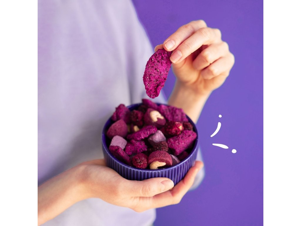 Tmavá, ale hravá. Mňa totiž poskladali z vitamíny nadupaných čučoriedok, kyselkavých černíc, exotického dračieho ovocia, šťavnatých coco smoothie štvorčekov a chrumkavých kešu kopčekov. Skrátka trefa do fialového!