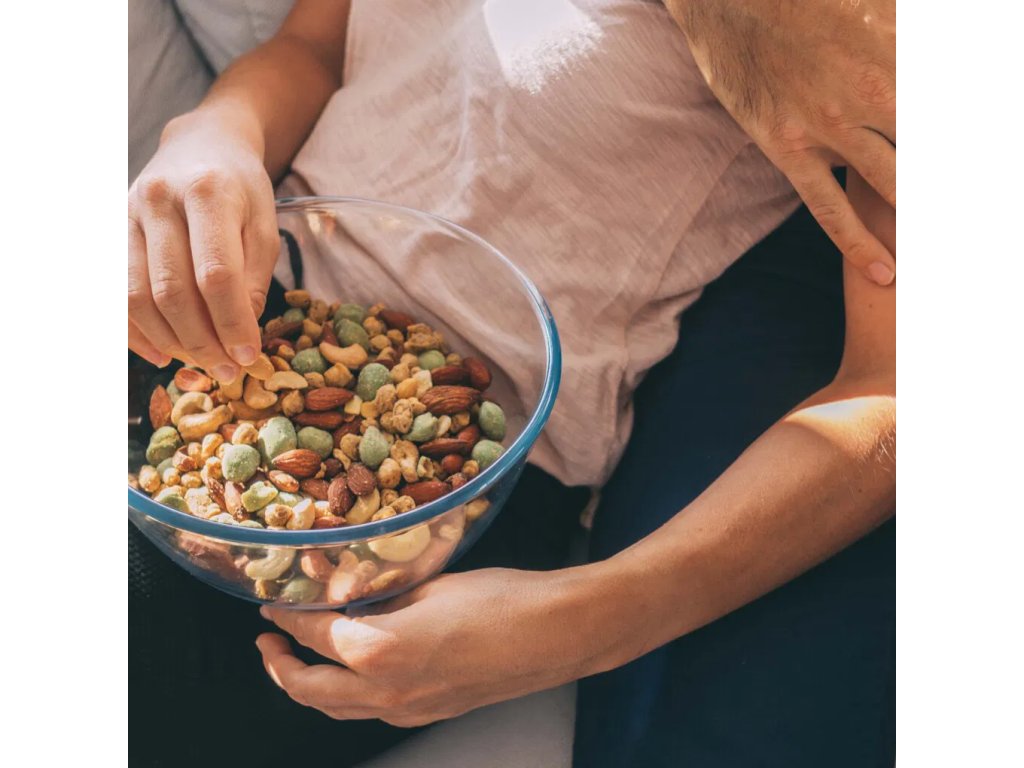 - Zloženie: KEŠU NA SUCHO PRAŽENÉ SOLENÉ (kešu ořechy jádra pražená 98,5 %, sůl 1 %, emulgátor arabská guma); ARAŠÍDY PIZZA (arašídy loupané pražené 75 %, pšeničná mouka, bramborový škrob, pizza koření 3 %: syrovátkový prášek, cukr, sůl, rajčatový prášek, zvýrazňovač chuti L-glutaman sodný, kvasnicový extrakt, bazalka, oregano, petržel, příchuť, česnekový prášek, sýrový prášek (sýr, syrovátkový prášek), černý pepř, barvivo paprikový extrakt; slunečnicový olej, kypřící prostředek uhličitan sodný, sůl, česnek, cukr); MANDLE UZENÉ (mandle jádra 90,9 %, slunečnicový olej, uzený prášek 3,6 %: kouřové aroma, sůl, dextróza, řepkový olej, maltodextrin, protispékavá látka oxid křemičitý, zvlhčující látka mléčnan vápenatý, emulgátor arabská guma); ARAŠÍDY WASABI (arašídy loupané pražené 27,5 %, pšeničná mouka, cukr, kukuřičný škrob, kukuřičná mouka, kokosový olej, sůl, sójová omáčka v prášku: pšenice, sója, dextrin, sůl, koji; koření: hořčičná příchuť, řepkový olej, zahušťovadlo arabská guma, dextrin, antioxidant rozmarýnové extrakty; kypřící látka: uhličitan sodný; bramborový škrob, regulátor kyselosti: kyselina citronová; barvivo: měďnaté komplexy chlorofylů a chlorofylinů; wasabi 0,003 %). Suroviny mohou být v různém poměru.