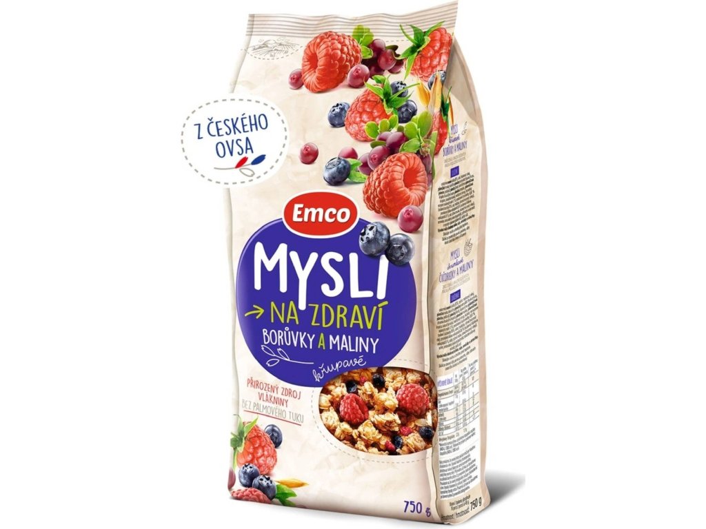 OVSENÉ vločky 51%, cukor, repkový olej, extrudát (kukurica, PŠENICA), PŠENIČNÁ múka, PŠENIČNÝ škrob, sušené maliny 1%, sušené a presladené čučoriedky 0,6% (čučoriedky 57%, cukor, slnečnicový olej), sušené a presladené brusnice 0,6% (brusnice 60%, cukor, ryžová múka, slnečnicový olej), aróma, antioxidant: (E304 askorbyl-palmitan, E306 tokoferolový extrakt, emulgátor: E322 slnečnicový lecitín), soľ jedlá