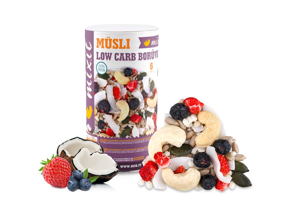 Hľadali ste mix müsli s minimom sacharidov a cukrov a zároveň s výdatnou porciou bielkovín a vlákniny? Low carb müsli s chrumkavými jahodami a čučoriedkami ponúkne chuťový koncert mrazom sušeného ovocia s chrumkami bohatými na proteín, kešu a 3 druhov semienok. Mix obsahuje iba 16,3 % sacharidov a z toho len 6,6 % cukrov z jahôd a čučoriedok. 27,3 % bielkovín v kombinácii rastlinnej a srvátkovej zložky uspokojí nielen náročných športovcov. Nabite sa low carb energiou od Mixit.