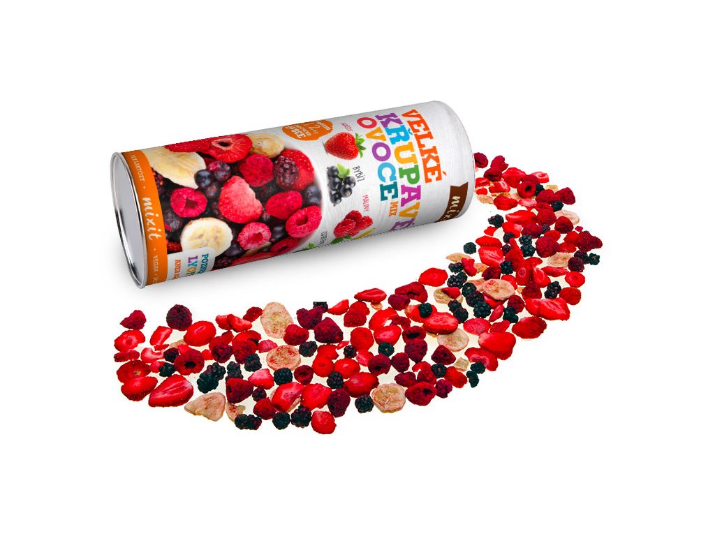 Veľký tubus plný chrumkavého mrazom sušeného ovocia. Pochutnajte si na malinách, jahodách, černiciach, čiernych ríbezliach a banáne v ich najlepšej forme bez použitia konzervantov a ďalších prísad. Chutí aj vonia úžasne!