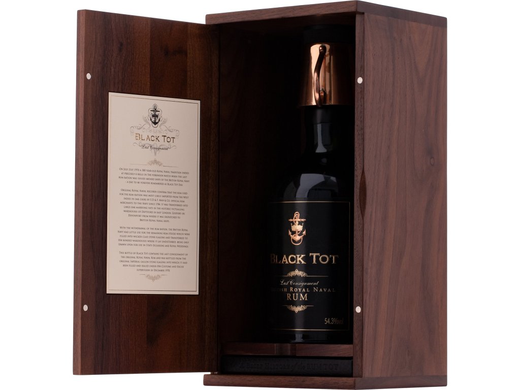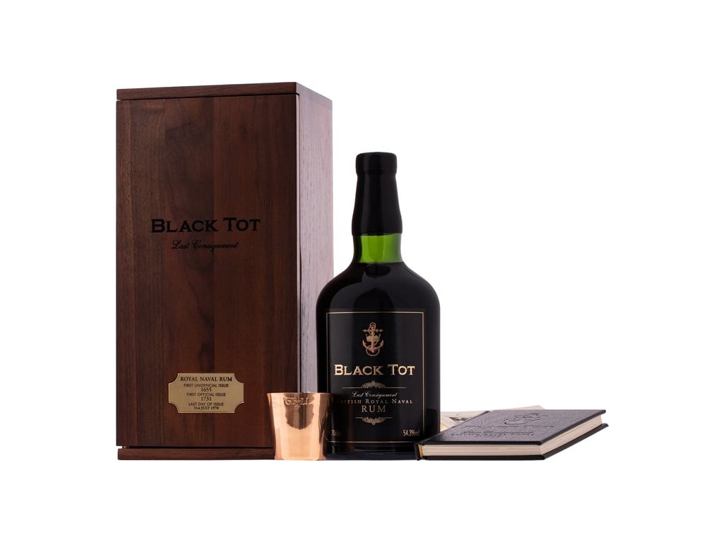 Štyridsať rokov po tzv. Black Tot Day dni z roku 1970, keď britské kráľovské loďstvo ukončilo svoj 300-ročný zvyk dávať námorníkom denný prídel rumu, nám Black Tot Last Consignment ponúka pohľad do histórie rumu a námorných tradícií. Rum pre kráľovské loďstvo sa dovážal zo Západnej Indie od roku 1784, hoci sa tradícia denných prídelov začala už v roku 1655. Black Tot Last Consignment sa vyrába z posledných zvyšných zásob rumu kráľovského loďstva, ktorý bol uložený v kamenných karafách od 31. júla 1970, keď zaznela posledná výzva na prídel rumu. Tento kus histórie sa krásne zafľašoval na 54,3 % ABV a predáva sa spolu s pohárom podobným pohárom, ktoré sa používali v časoch denných prídelov rumu, dreveným puzdrom, poukážkou na prídel rumu a knihou o histórii Black Tot, ktorú napísal odborník na rum Dave Broom.