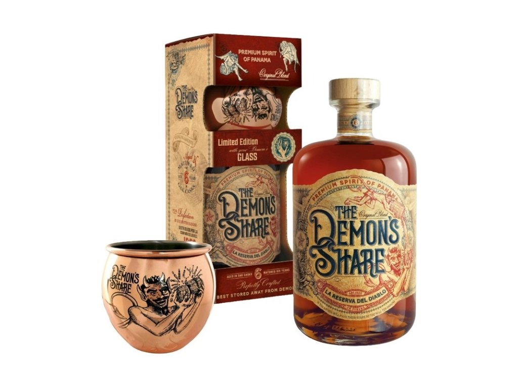Toto darčekové balenie The Demon’s Share 6 Y.O. prichádza s jedinečným kovovým pohárom s medeným leskom, ktorý okamžite upúta svojím diabolským dizajnom. Na jeho povrchu sa vyníma rytina s postavou démona a logom značky, vďaka čomu pôsobí luxusne aj hravo zároveň. Celé balenie je ladené v rustikálnom štýle s detailmi pripomínajúcimi staré panamské etikety – ideálny darček pre fanúšikov netradičných rumových spiritov.